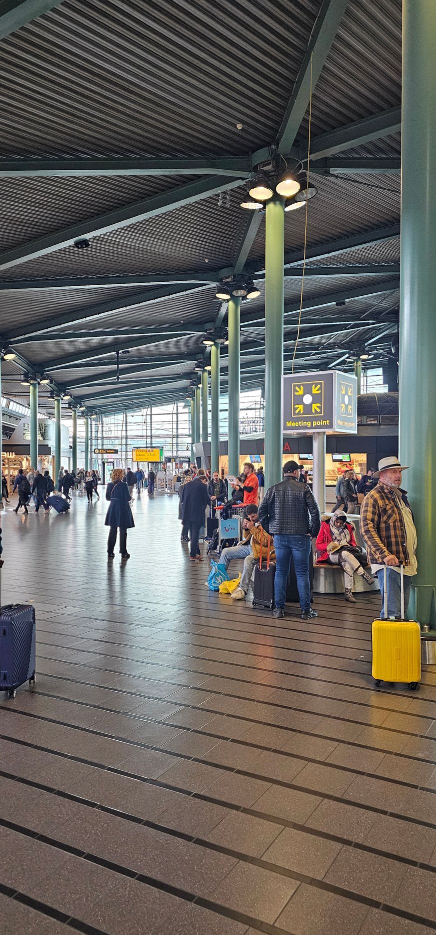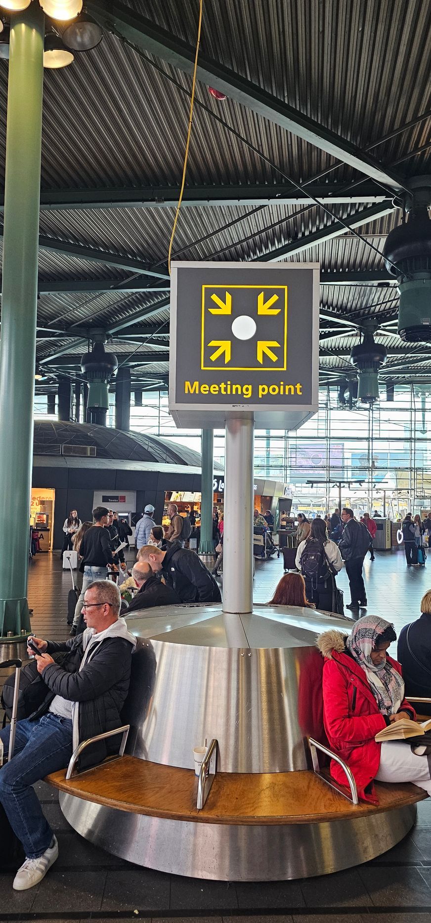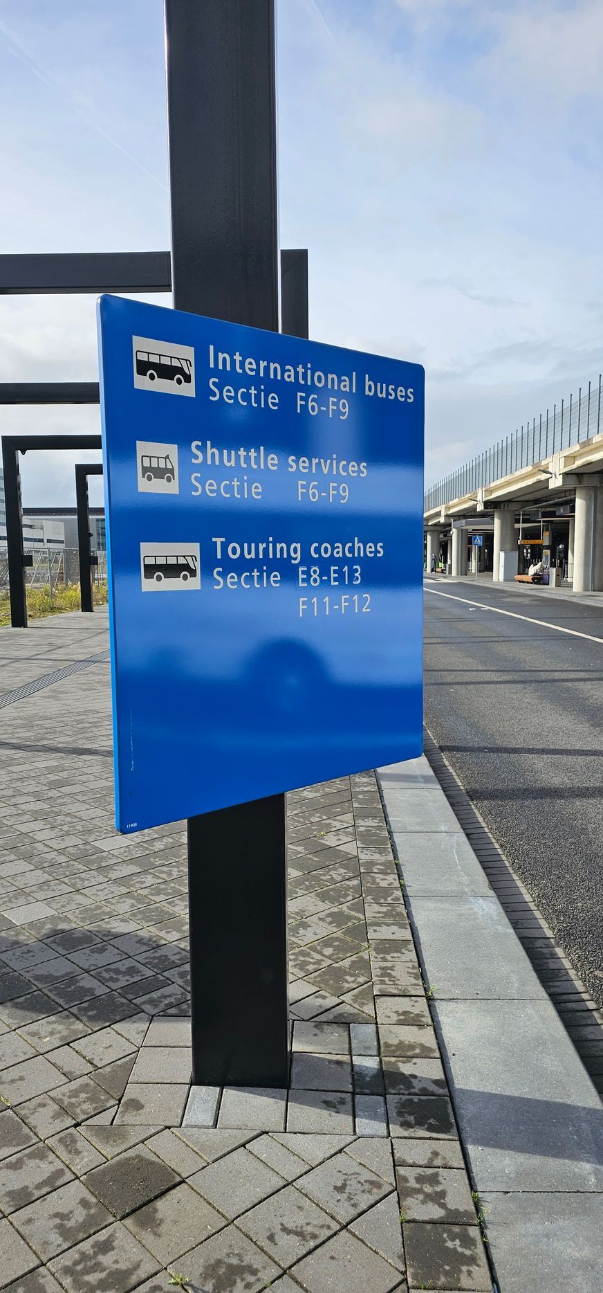 Due to the busy conditions at Schiphol Airport, the meeting point is located about 50 meters further from the usual spot. It can be easily recognized by the Meeting Point sign. Below, you will find photos showing how to reach this location. After gathering, we will walk together to the white Hellingman buses.